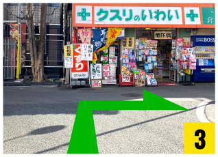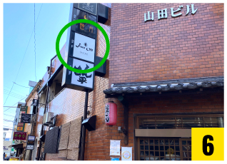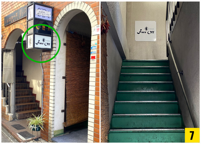 • 約20mほど直進すると、山田ビルが見えてきます。こちらのビルの2階にフェイスオフがございます。