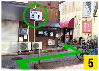 • 居酒屋泰平の看板が見えてきますので、そこを右に曲がり、すぐカラオケサロンかりんの看板前を左に進みます。